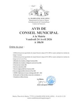 Le conseil Municipal est convoqué le vendredi 24 avril 2026 à 18h30.