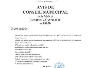 Vie municipale Conseil Municipal Le conseil Municipal est convoqué le vendredi 24 avril 2026 à 18h30. 24 Avr 2026 Time: 18h30m Mairie Localiser Choice of plan Précédent Retour à la liste Suivant