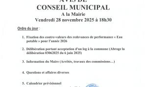 28 Nov 2025 Vie municipale Conseil Municipal Le conseil municipal est convoqué le vendredi 28 novembre à 18h30 en mairie. Mairie